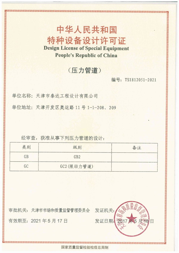 - 泰達(dá)設(shè)計(jì)喜獲“壓力管道”特種設(shè)備設(shè)計(jì)資質(zhì)5月18日,天津市泰達(dá)工程設(shè)計(jì)有限公司通過(guò)天津市市場(chǎng)和質(zhì)量監(jiān)督管理委員會(huì)審批,取得“中華人民共和國(guó)特種設(shè)備設(shè)計(jì)許可證(壓力管道)”,獲準(zhǔn)從事GB2、GC2級(jí)壓力管道設(shè)計(jì)工作。該項(xiàng)資質(zhì)的獲得,進(jìn)一步增強(qiáng)了泰達(dá)設(shè)計(jì)在熱力工程設(shè)計(jì)方面的市場(chǎng)競(jìng)爭(zhēng)力。