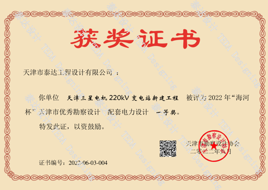 近日,我公司設(shè)計完成的天津三星電機220kV變電站新建工程等多項工程,分別榮獲“海河杯”天津市優(yōu)秀勘察設(shè)計一、二、三等獎。“海河杯”作為天津市勘察設(shè)計領(lǐng)域的最高級別獎項,獲獎工程代表了天津市勘察設(shè)計領(lǐng)域的最高技術(shù)水平,截至本年度公司已連續(xù)第七年獲此殊榮。
