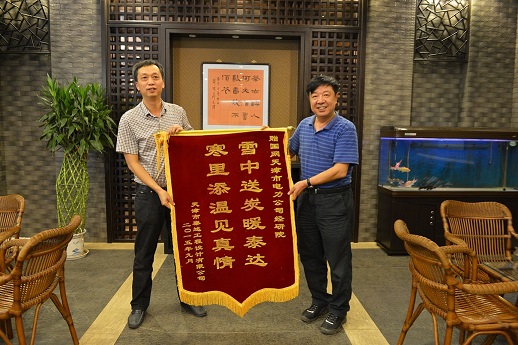 2015年9月16日下午,我公司董事長兼總經(jīng)理武文杰、副總經(jīng)理閻喆與綜合辦公室副主任李雪一行三人前往國網(wǎng)天津市電力公司經(jīng)濟技術(shù)研究院(以下簡稱“天津經(jīng)研院”),向天津經(jīng)研院在“8.12”爆炸事件中對我公司的傾情援助表示衷心感謝,并送上印有“雪中送炭暖泰達,寒里添溫見真情”的一面錦旗。