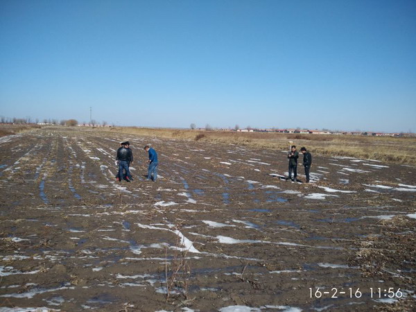 本次交樁現(xiàn)場(chǎng)為農(nóng)田耕地,由于天氣回暖造成的雨雪融化給交樁工作帶來(lái)了極大困難。在整個(gè)交樁過(guò)程中,人員、車輛都數(shù)次陷入淤泥中,每個(gè)人的腳上腿上甚至身上都是一片泥污。